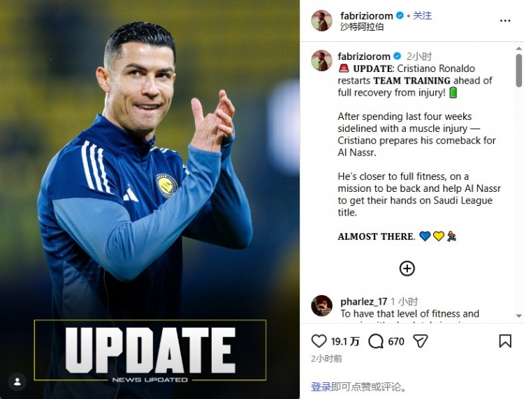 罗马诺在社交媒体上这样写道:“最新:C罗恢复球队合练,距离伤愈复出一步之遥。在因肌肉伤势缺阵长达四周后,C罗正在积极备战,准备重返赛场为利雅得胜利效力。”