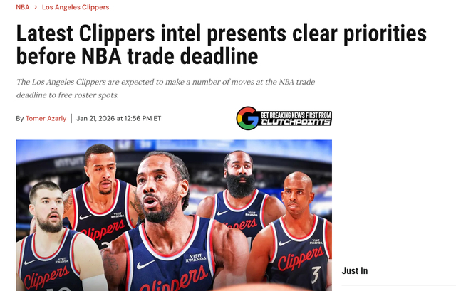 文中还提到,快船队正在想办法将两位出色的双向合同球员(乔丹-米勒、科比-桑德斯)转为标准合同,快船队需要腾出两个空位,从目前来看保罗、科比-布朗两人是最可能在交易截止日前离开的球员,科比-布朗、保罗两人都有可能被快船直接裁掉。